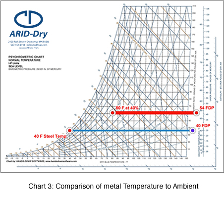 The challenge of controlling the internal moisture levels is the size and complexity of typical generating plants. Generating plants can expose the structures to variable temperatures; from a sub-basement feed water system to external flue gas treatment devices. The structure can have a variety of structural temperatures, thereby making it difficult to have one dew point set point that would provide protection for all components. The areas located in cool areas could see average summer steel temperatures of 50° to 60° F Degrees while components located in higher areas or external to the plant, might be exceed 75° F. During cold weather months components connected or exposed to the outdoors could see average steel temperatures of 0° to 40° F. The specific vapor pressure of air at the recommended 40% RH at normal heating temperatures is very different. (See Chart 3). The chart shows a steel temperature of 40° F with an interior air condition of 75° to 80° F at 40% RH. Both of those air readings show a dew point condition higher than the steel, there will be condensation in this example