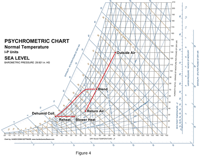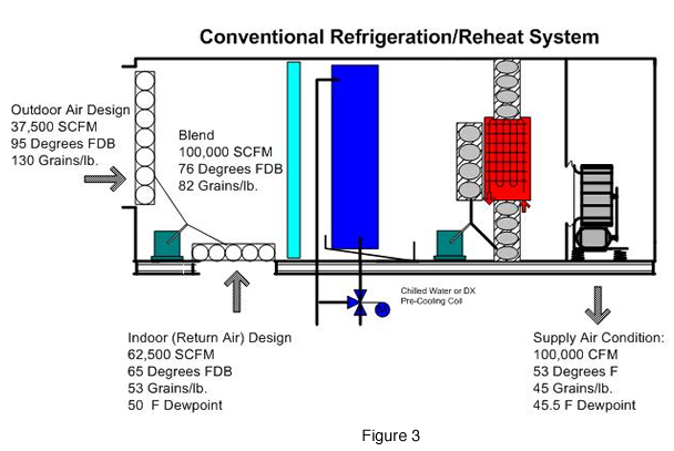 To properly maintain humidity levels we need to estimate moisture loads during occupied events and determine the outside air requirements. We will use an example of a 20,000 seat arena with a mechanical room in each quadrant serving approximately 25% of the space. For the purpose of this example we will compare a refrigeration system designed to maintain 65°F at 40% RH (36.6 Grains of Moisture/Pound of Dry Air) with a desiccant system designed to maintain 65°F at 40% (36.6 Grains of Moisture/Pound of Dry Air). Each system provides a 12°F and 8 grain depression to accommodate internal loads. For normal application each quad will use 100,000 SCFM (Standard Cubic Feet Minute @ 70°F) total air with 37,500 SCFM of outside air based on 7.5 SCFM per person. The total arena will use approximately 400,000 SCFM with 150,000 SCFM of outside air. The system below would be located in each quad. The diagrams below will show dew-points and Grains/Lb in lieu of relative humidity. Relative Humidity can be confusing with multiple temperature changes. |