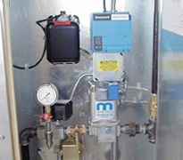 < Our reactivation burner flame safeguard system is an industrial Honeywell R7895A instead of a commercial-or residential style "ignition module." The standard gas train on gas-fired units is an ANSI type, and includes inlet regulator, automatic main and pilot valves, an electronic modulating valve, in addition to safety manual valves.